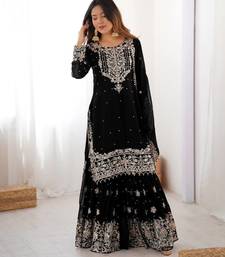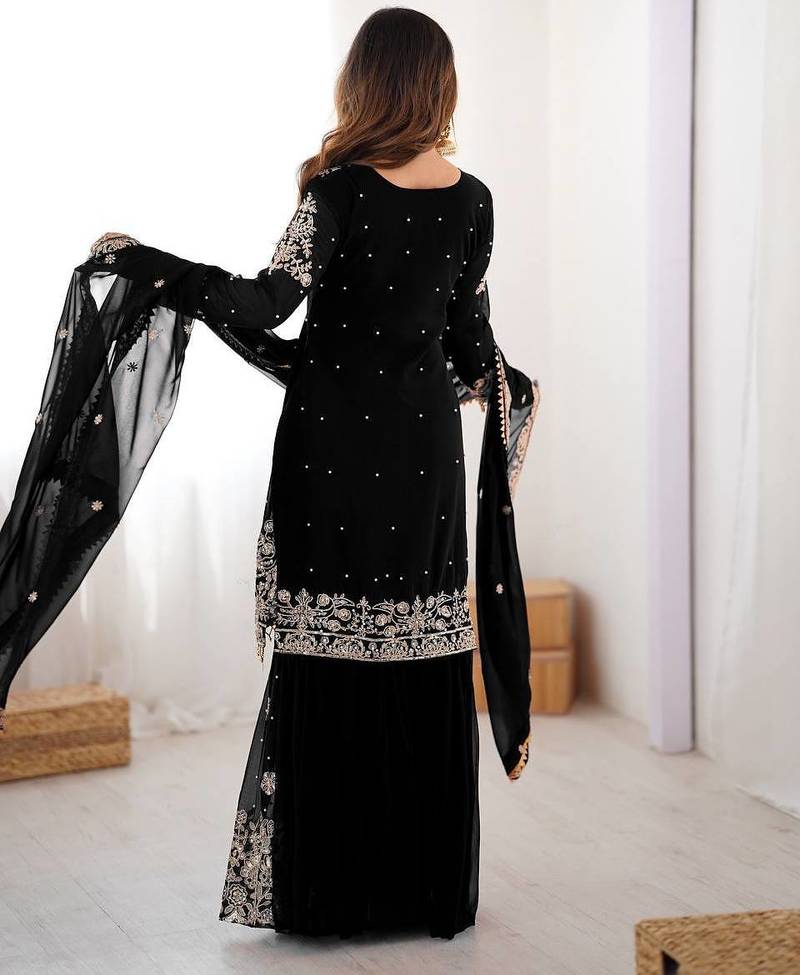 Black color thread with dori embroidery,sequin,thread and pearl work faux georgette top bottom dupatta set stitched