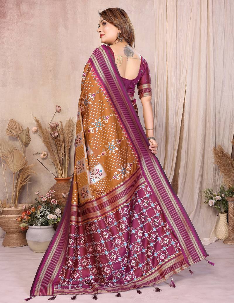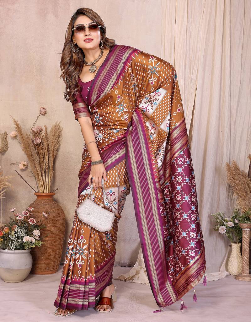 Brown color ikat weaving silk blend saree