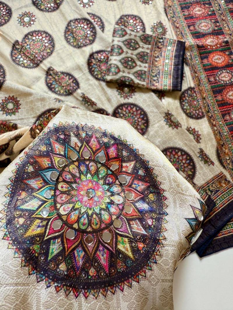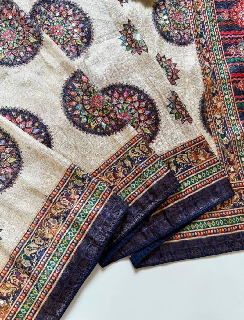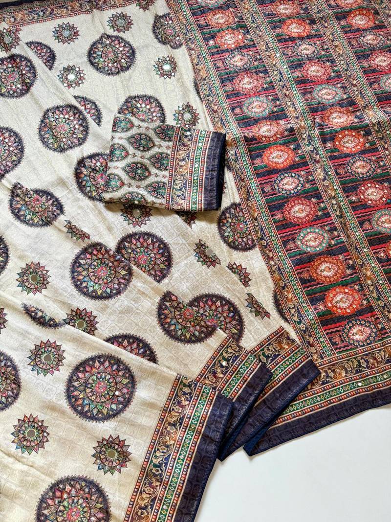 | Product Description | Saree : Dola Silk Full Jari Jaqurad Weaving All Over Fabric Soft And Smooth Fall Feel Work : Original Uhd Position Print Type Digital Printing With Original Mirror Work Heavy Dyuti Sticky Gum With Dori Piping Fitting Blouse: With Blouse Piece Is Full Mirror Work |