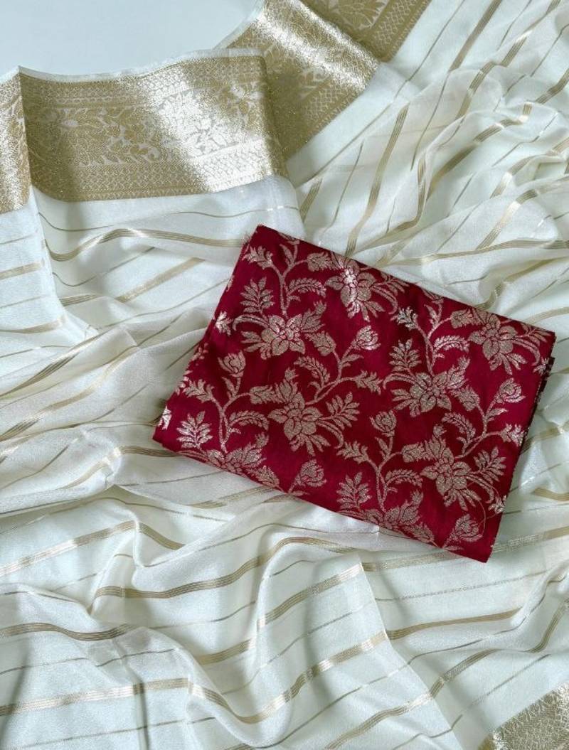 Off white color jari jaqurad woven with hand daying work georgette saree