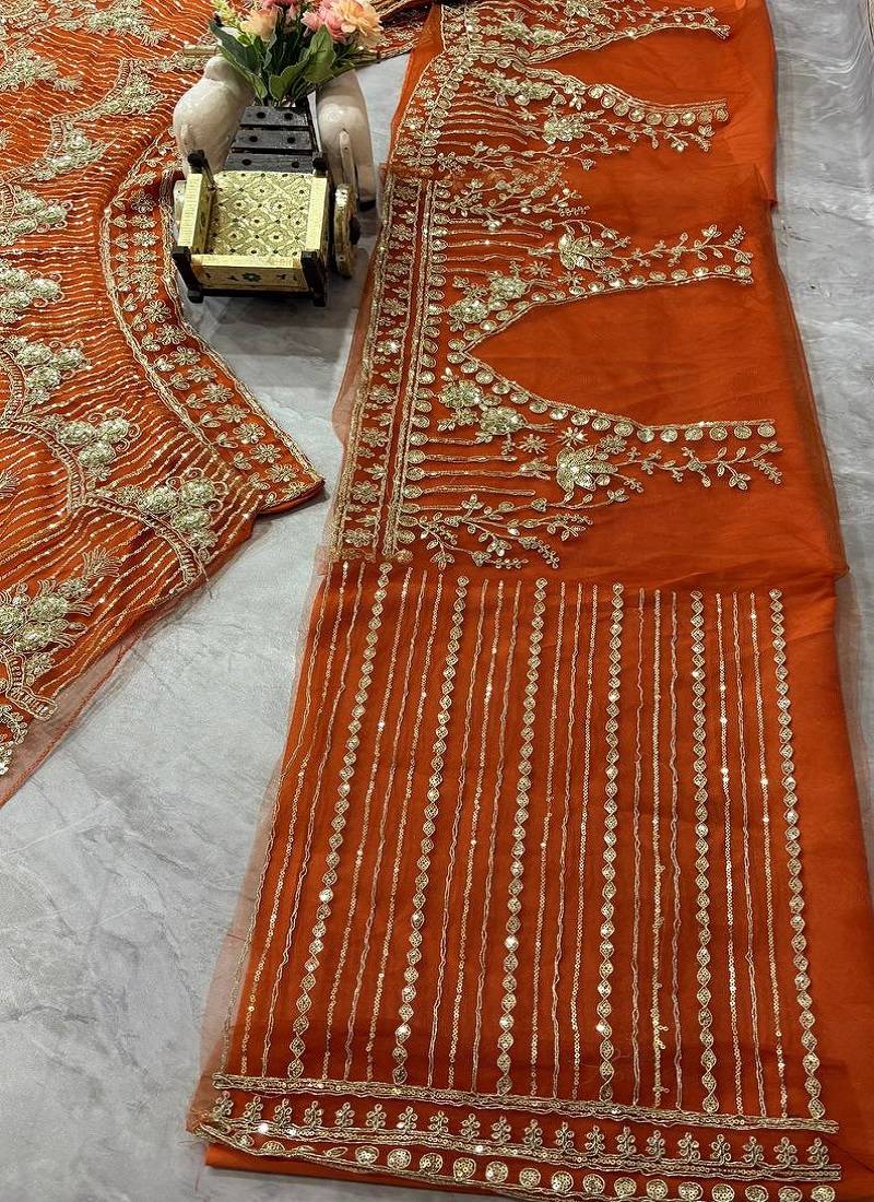 Orange Color Sequins Coding Work Net Lehenga