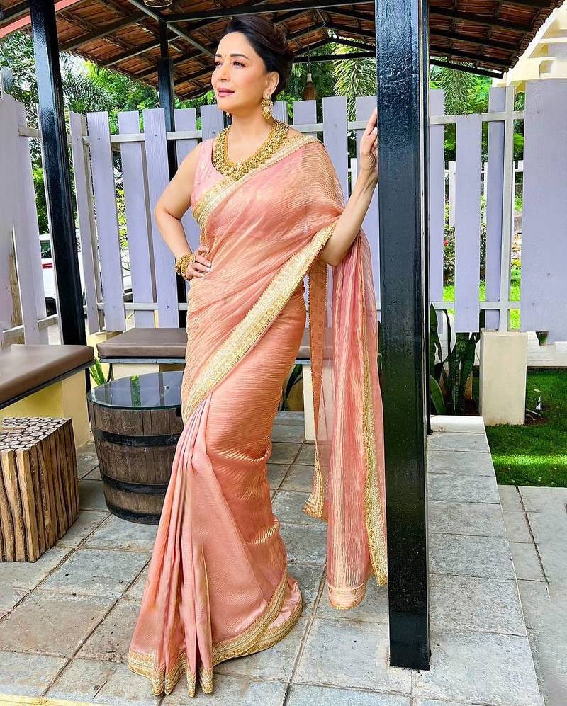 Peach color sequance and dori embroidery work banarsi crush twill saree