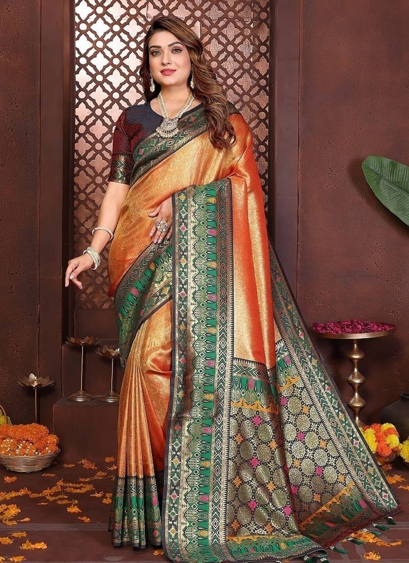 | Product Name | Peach Color Zari Weaving Banarasi Tissue Silk Blend Saree | |