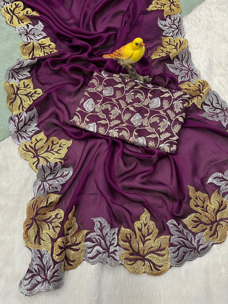 | Product Description | Saree Fabric: Satin Chiffon Silk Work: Beautiful Designer Jari Thread Embroidery Work Of Leaf Design With Cutwork Border. Craft : Embroidery Blouse Fabric : Banarasi Silk