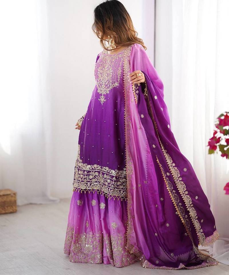 | Product Name | Purple Color Dori,Sequence And Rivet Moti Work Chinon Silk Top Bottom Dupatta Set | |