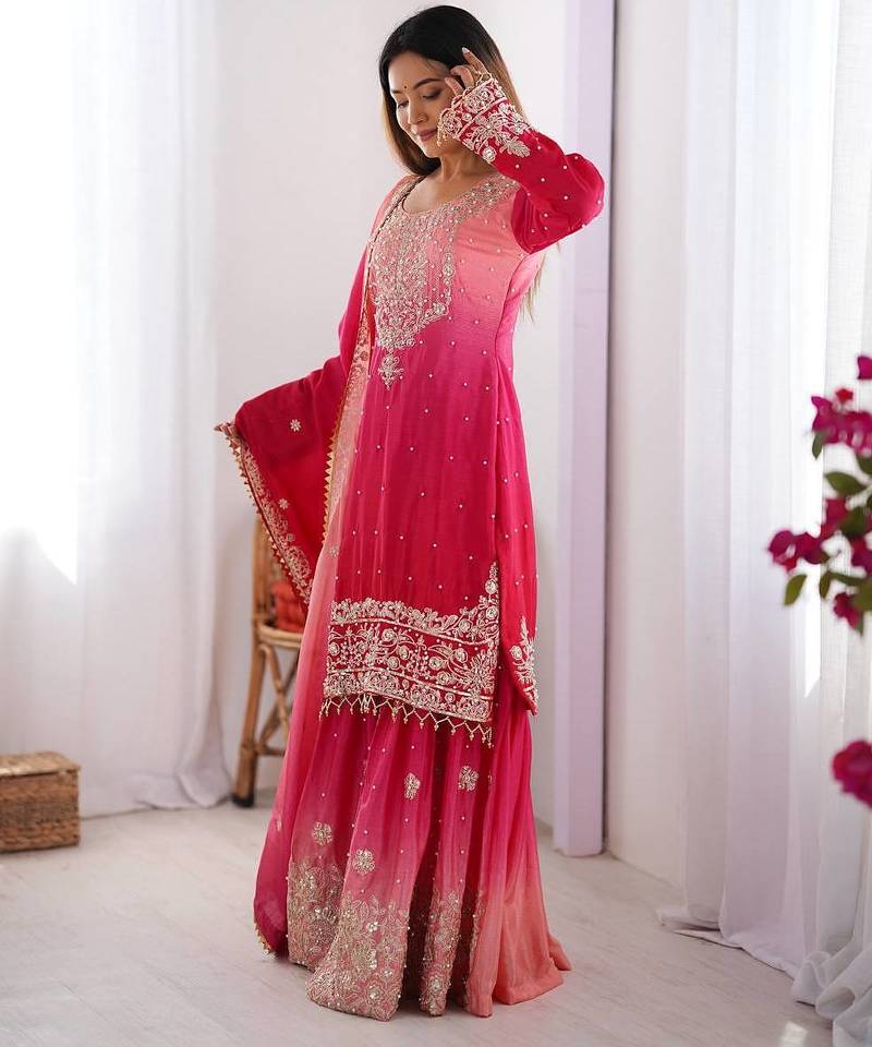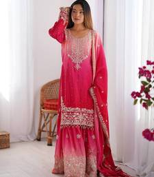 Rani pink color dori,sequence and rivet moti work chinon silk top bottom dupatta set stitched