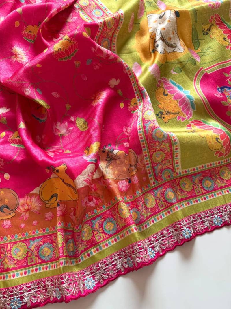 Work : Position Print Tyap Digital Print Pashmina Test Pichvai Pen Kalamkari Digital Printing With Hevey Coding Siquence Embroidery Cut Work Lace Fitting
