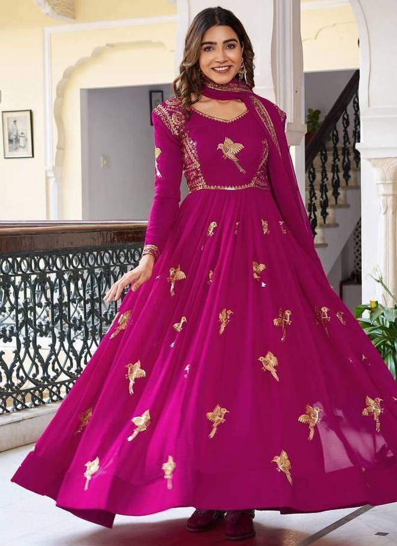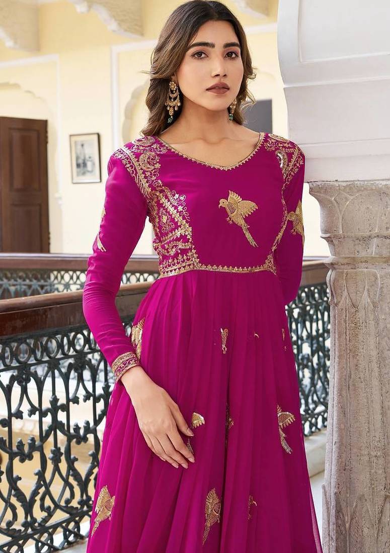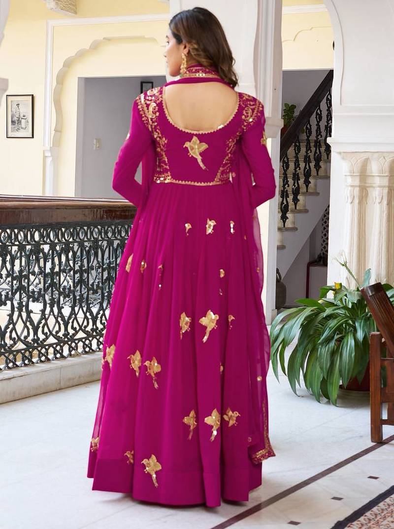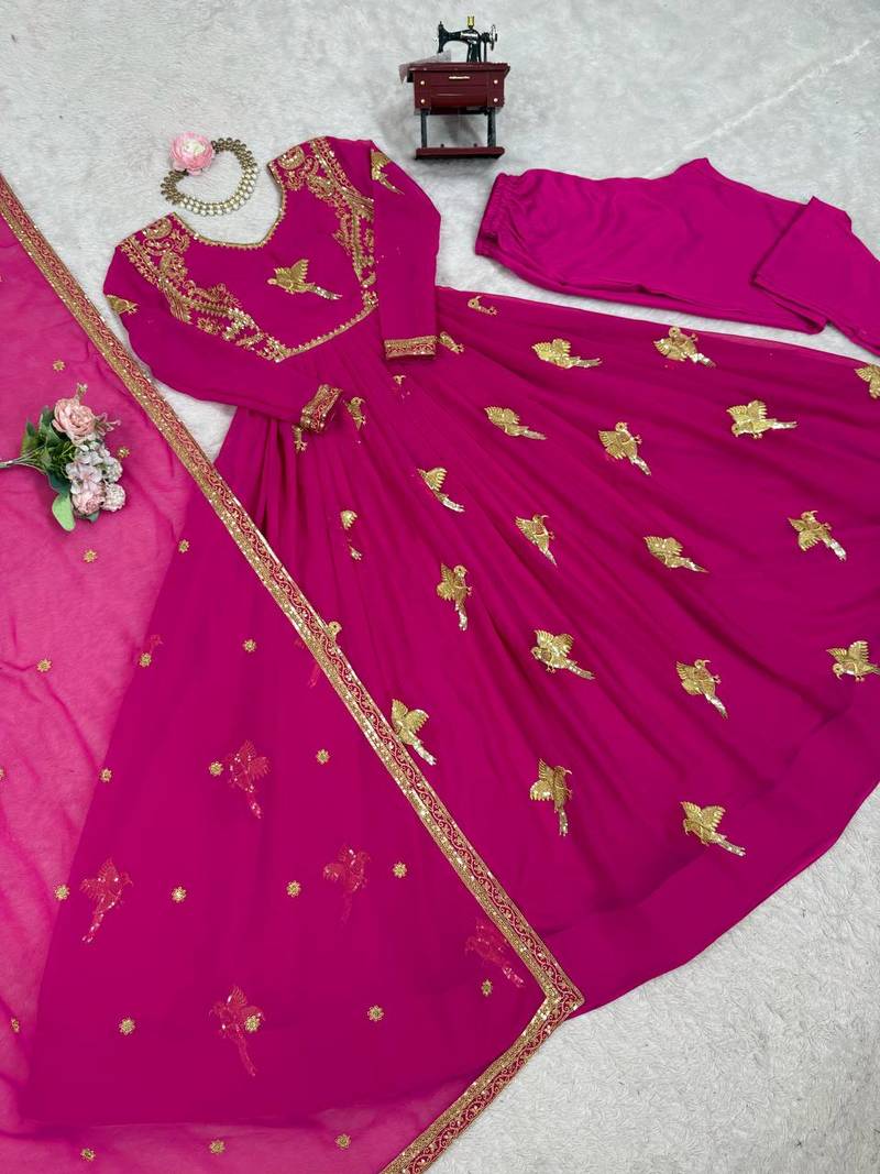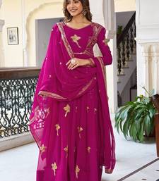 Rani pink color thread with sequence work faux georgette top bottom dupatta set stitched