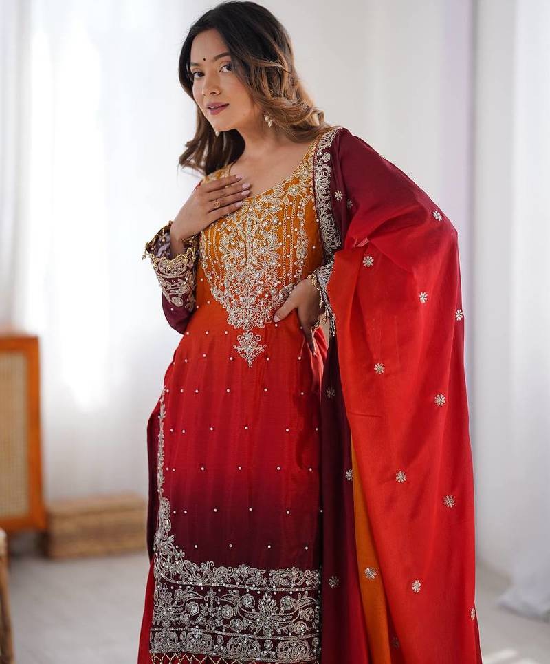 | Product Name | Red Color Dori,Sequence And Rivet Moti Work Chinon Silk Top Bottom Dupatta Set | |