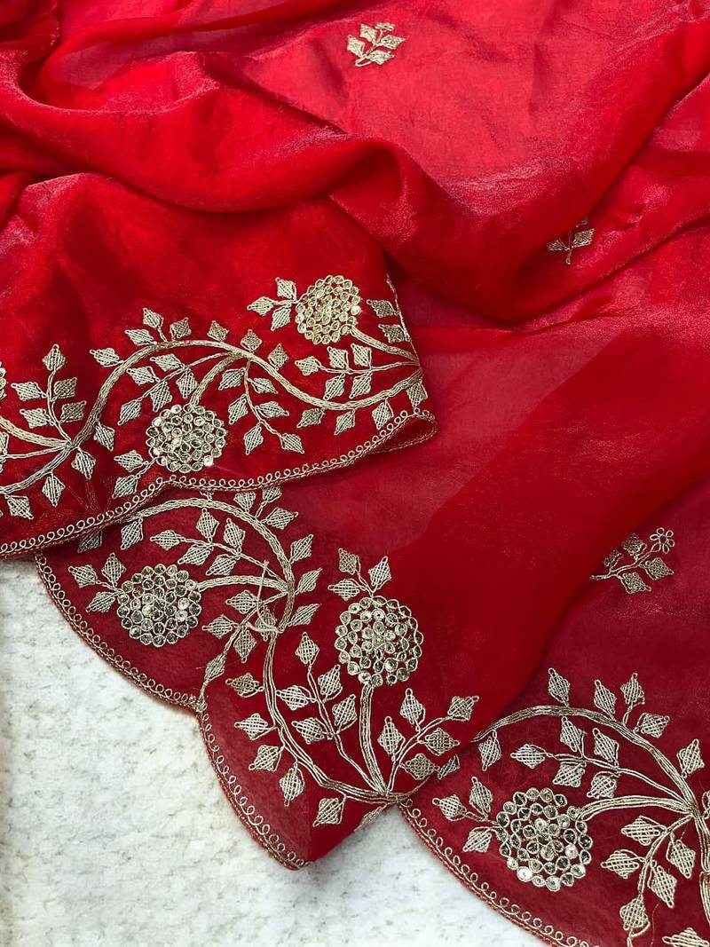 Red color plain saree with sequins embroidery and jaipuri dori work satin silk blend saree