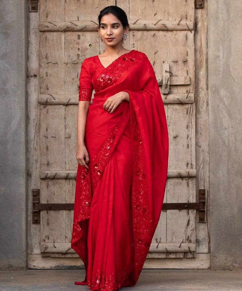 | Product Name | Red Color Plain Saree With Sequins Embroidery Work Satin Silk Blend Saree | |
