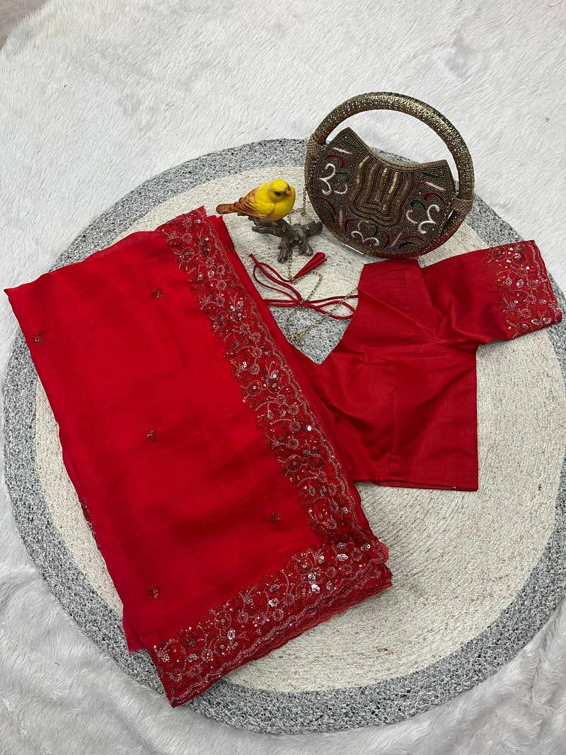 Red color plain saree with sequins embroidery work satin silk blend saree
