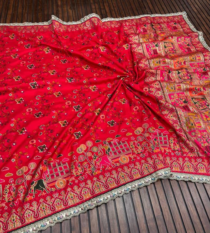 Red color zari weaving embroidery lace pashmina silk blend saree