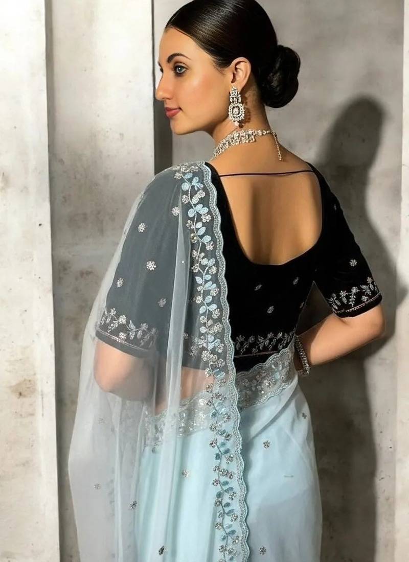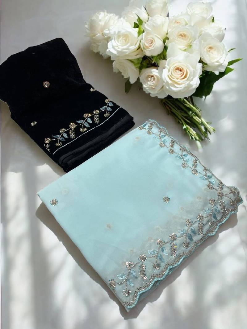 | • | Saree | : | Color- Sky Blue / Fabric- Faux Georgette |