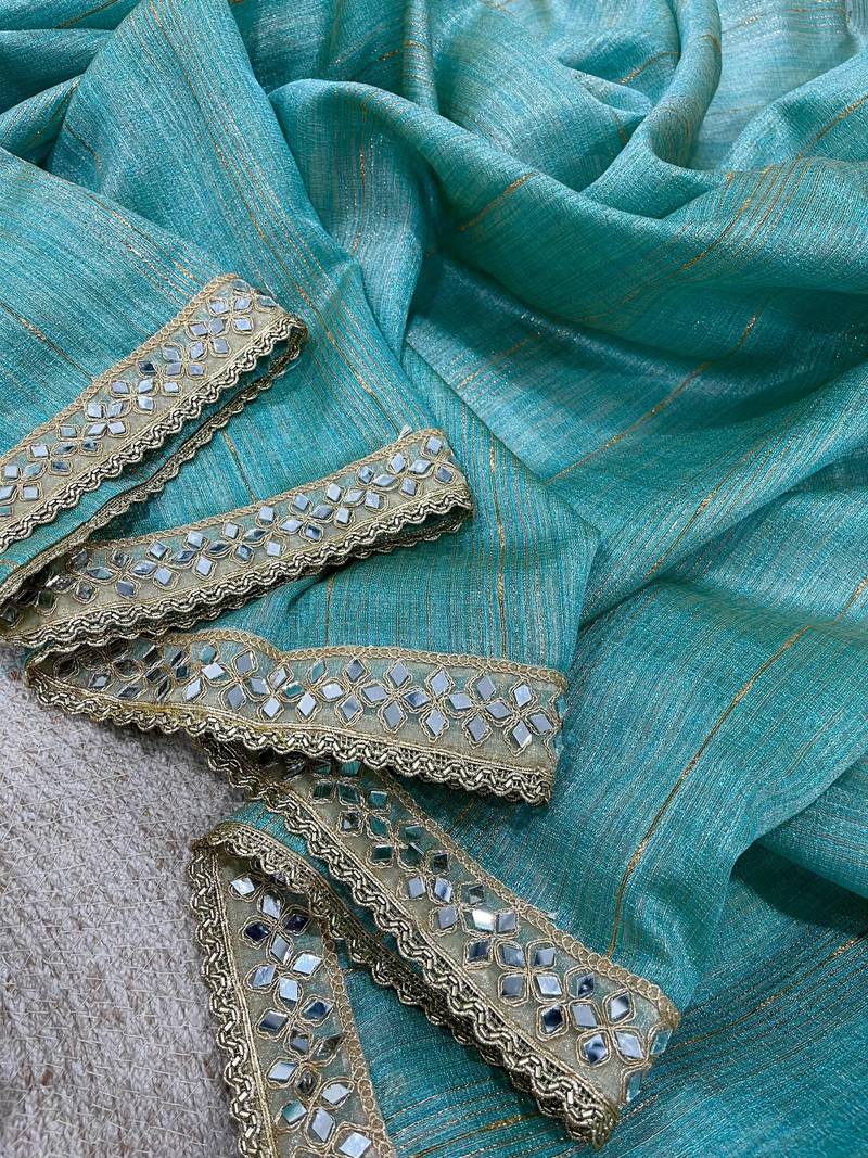 Sky blue jari dori embroidery cotton saree with mirror work
