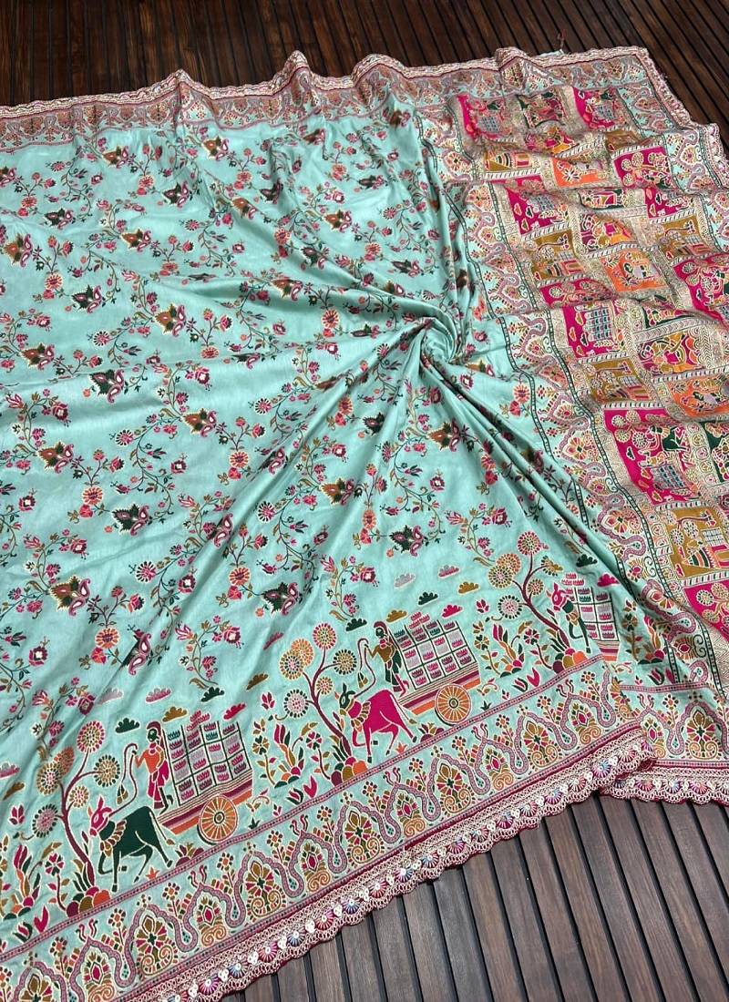 Sky blue color zari weaving embroidery lace pashmina silk saree