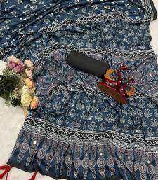 Teal color ajarakh print real mirror work crepe silk saree