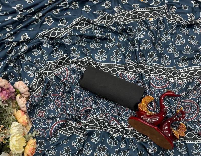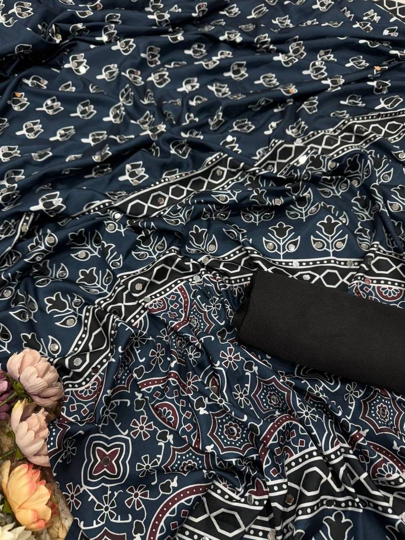 | Product Description | Saree Fabric : Crepe Silk Work : Beautiful Ajarakh Print Real Mirror Work And Beautiful Tussle Blouse: Satin |