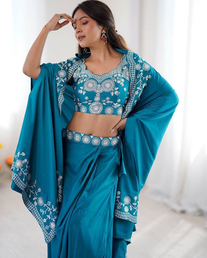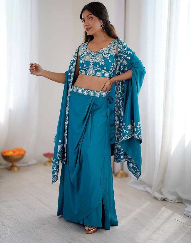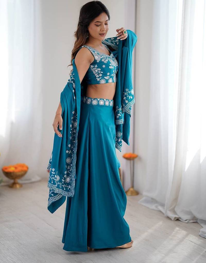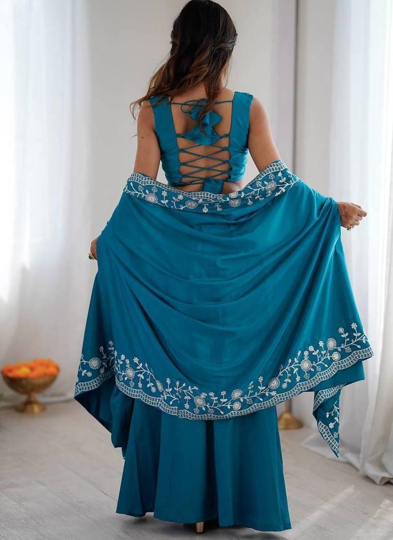 | Product Name | Teal Color Thread With Sequence Work French Crepe Top Bottom Set | |