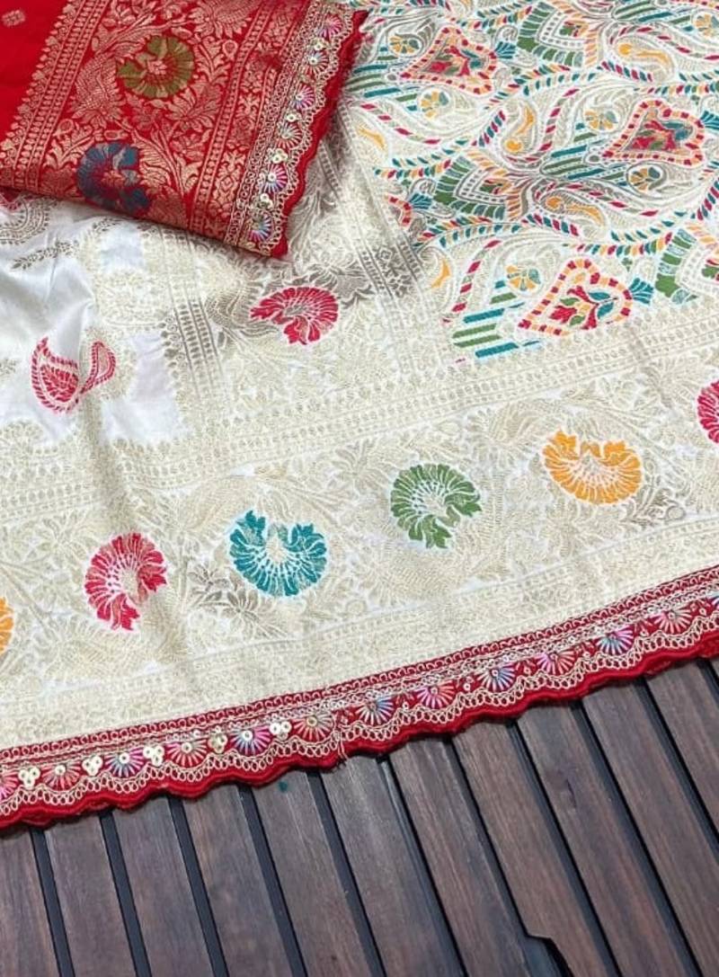 White color meenakari jaqurad work dola silk saree