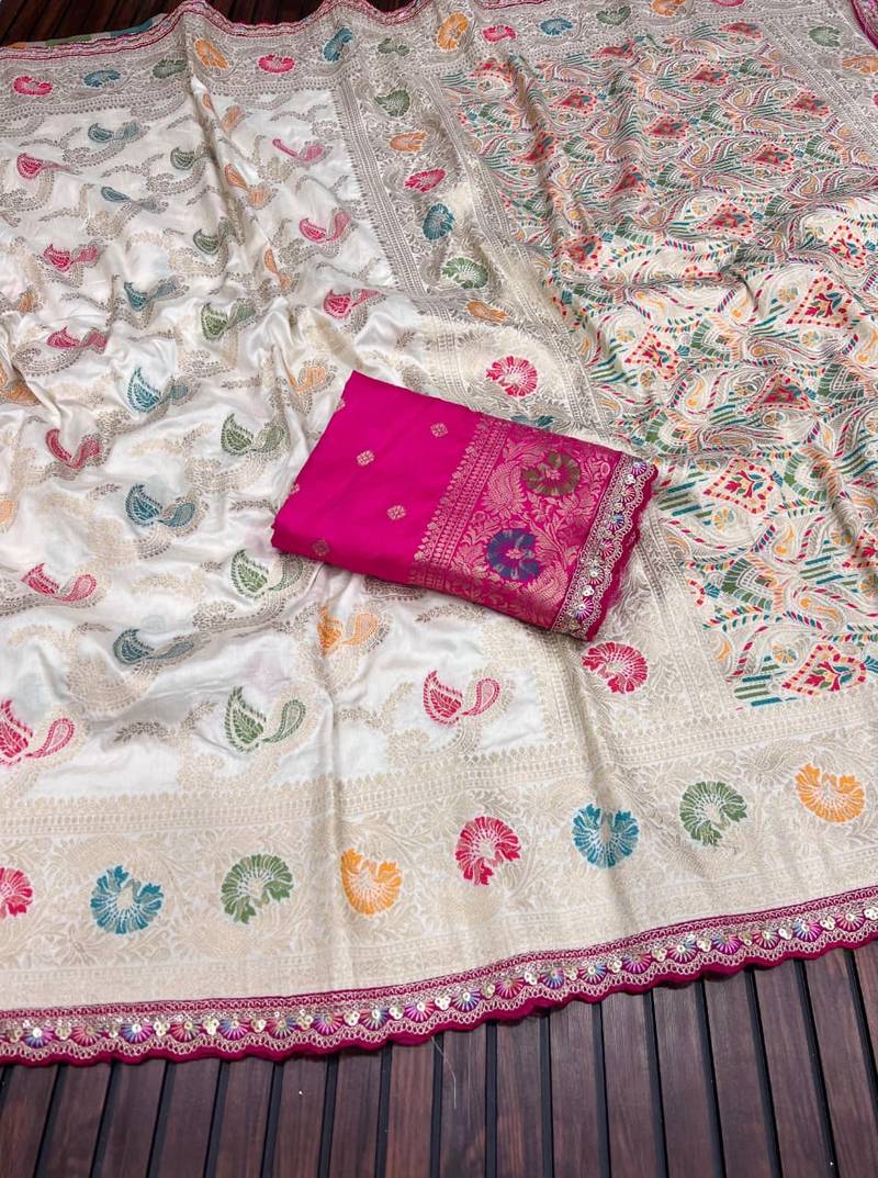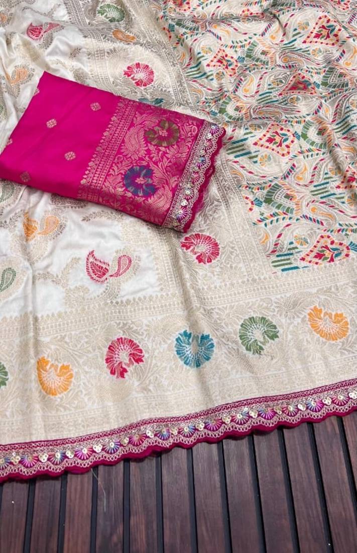 | Product Name | White Color Meenakari Jaqurad Work Dola Silk Blend Saree | |