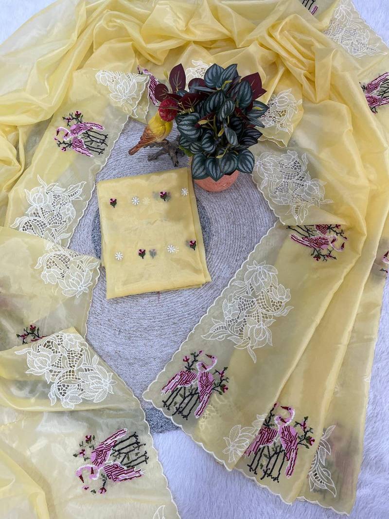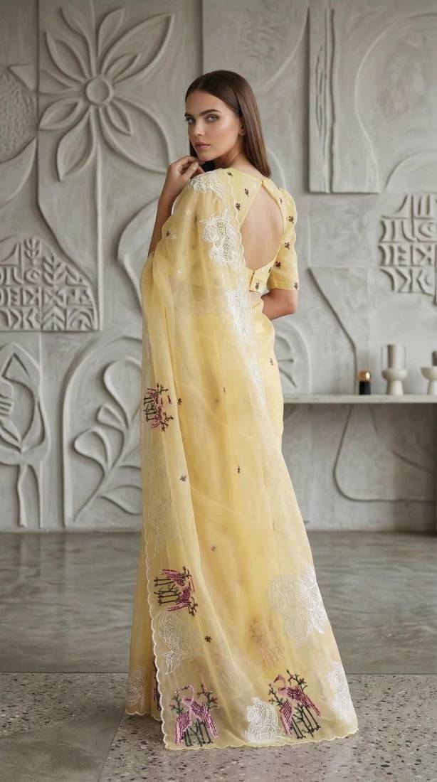 | Product Name | Yellow Color Thread Embroidery Work Crystel Organza Saree | |