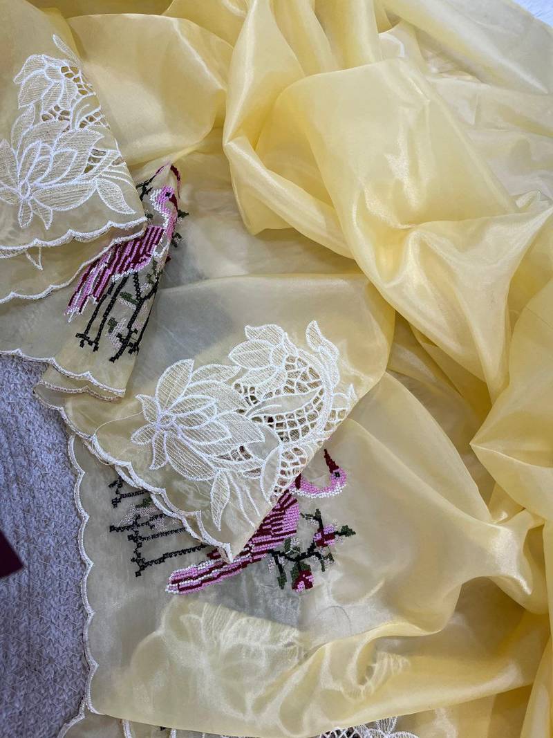 Yellow color thread embroidery work crystel organza saree