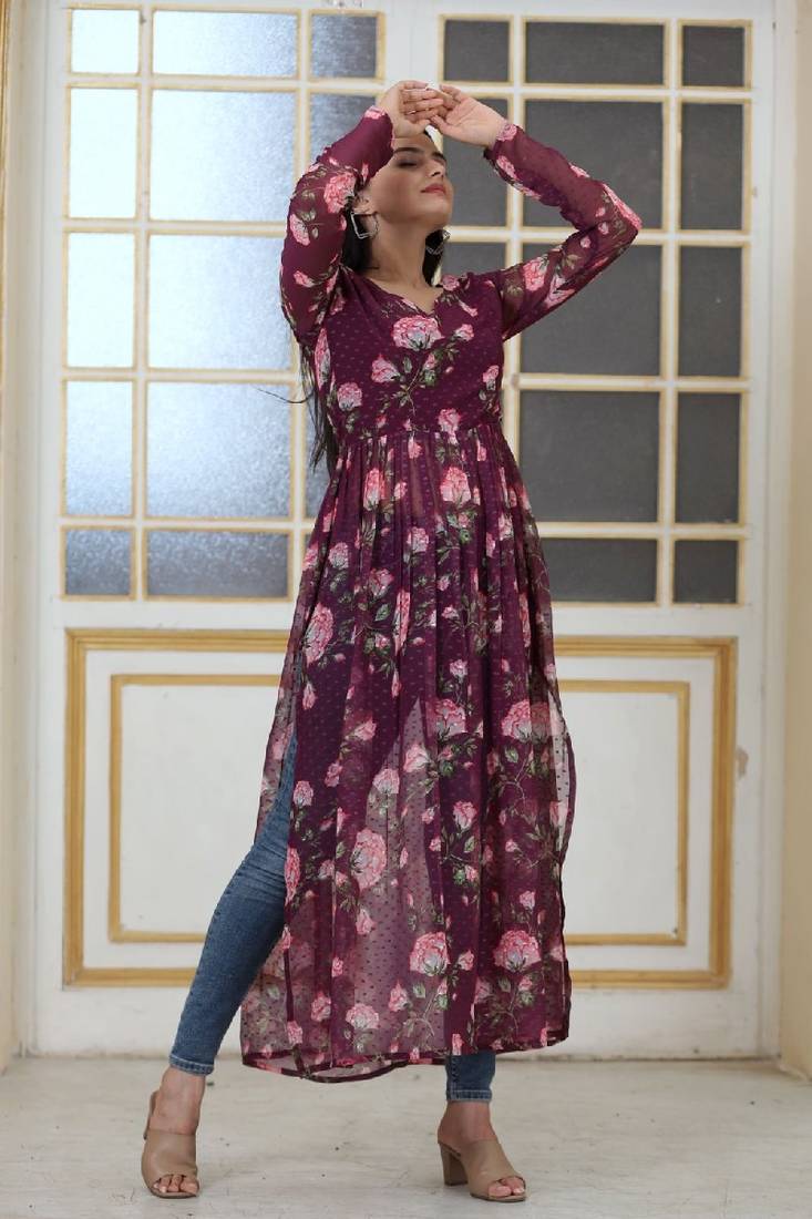 | Product Name | Wine Butti With Floral Degital Print Nayra Cut Kurti | |