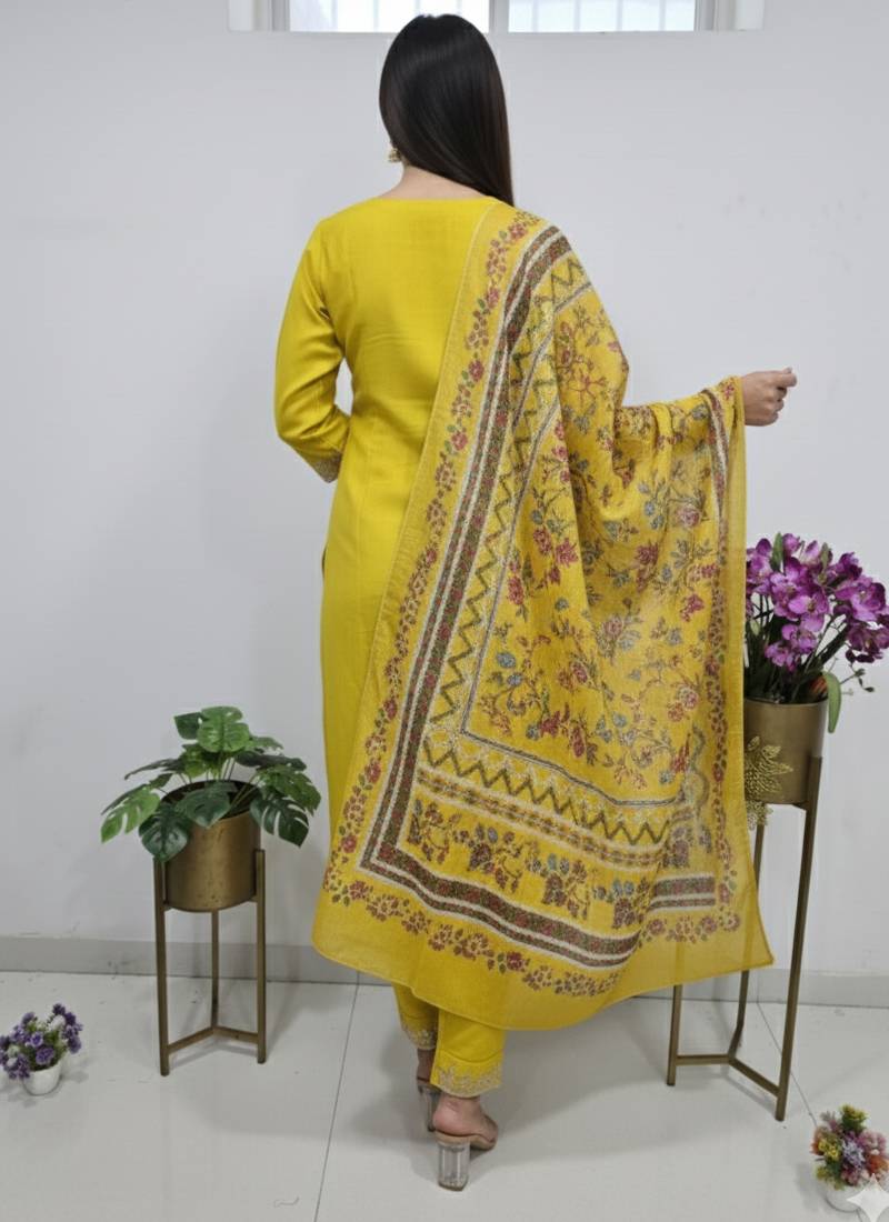 Golden Yellow Cotton Silk Embroidered Salwar Suit With Floral Printed Dupatta