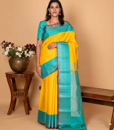 Bright yellow and turquoise blue pure kanchi silk saree