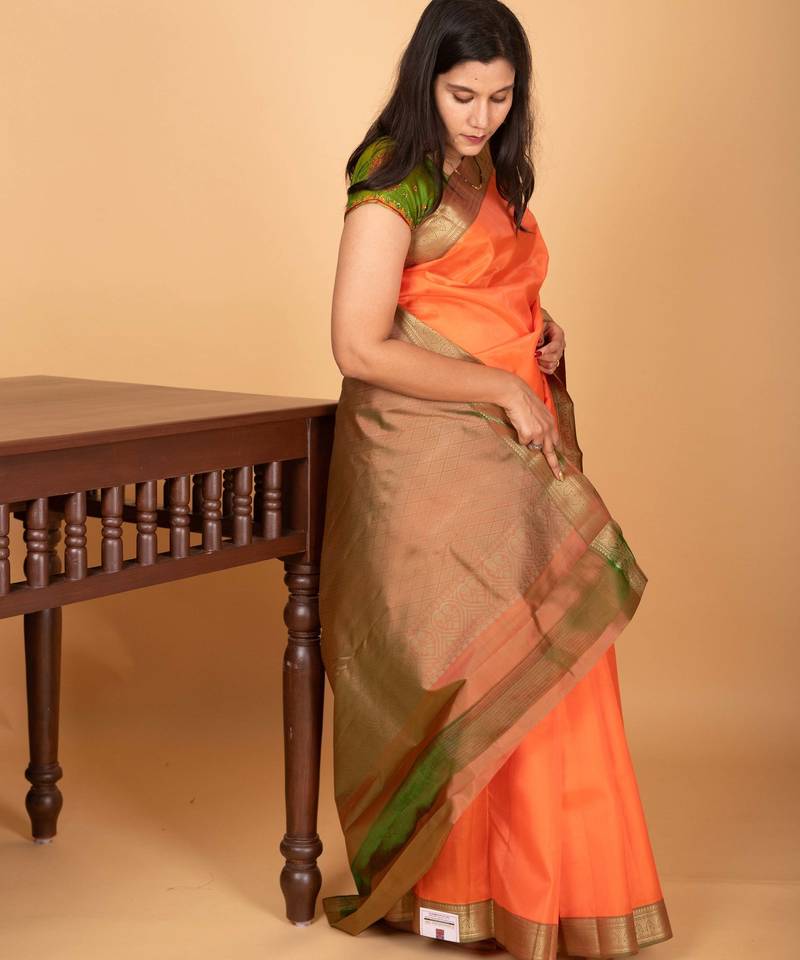 | Product Name | Coral Orange And Dual Tone Green Zero Zari Pure Kanchi Silk Saree | |