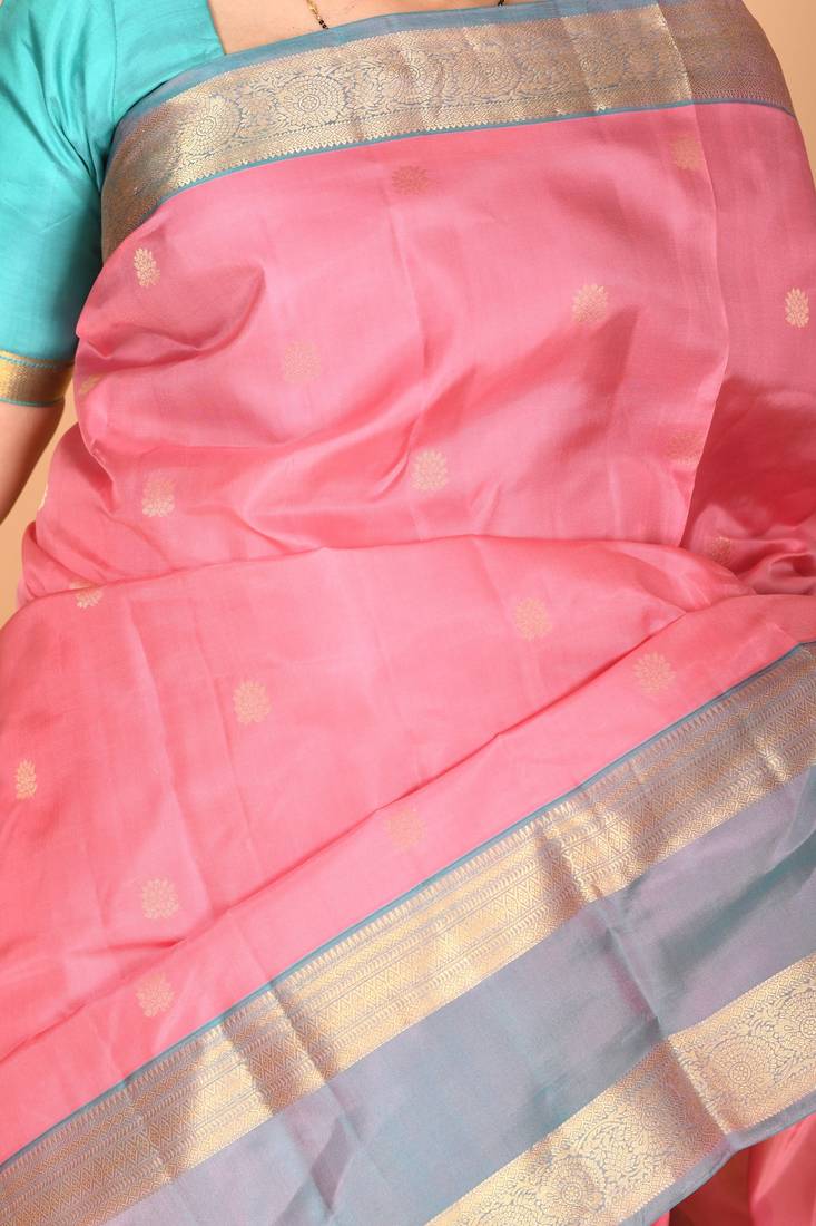 Paneer rose pink and dual tone blue retta patta border pure kanchi silk saree