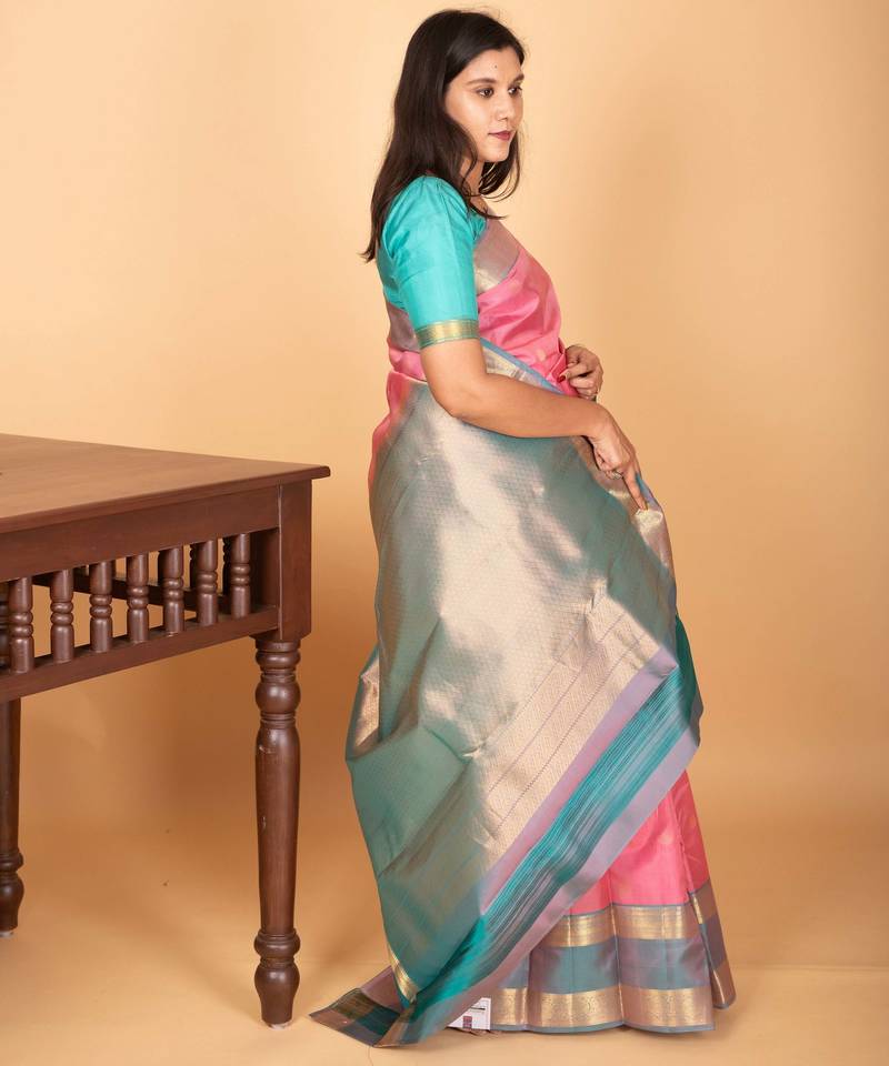 | Product Name | Paneer Rose Pink And Dual Tone Blue Retta Patta Border Pure Kanchi Silk Saree | |
