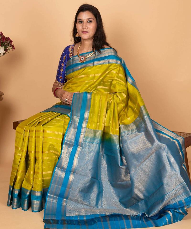 | Product Name | Pear Green And Blue Korvai Pure Kanchi Silk Saree | |