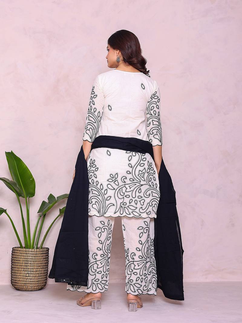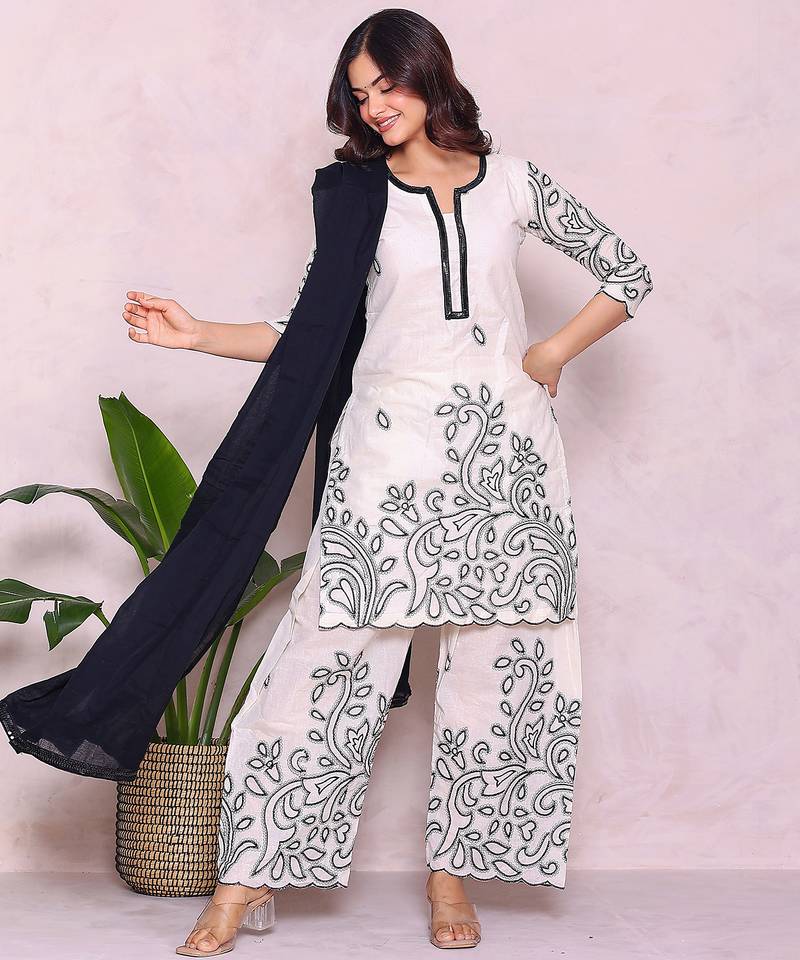 Beige floral embroidered pure cotton kurta with palazzo set stitched