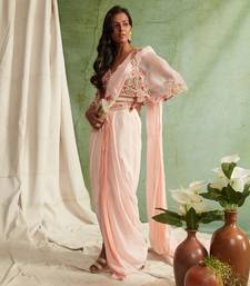 | Product Description | Blush Pink Pre Draped Saree With Embroidered Blouse, Short Cape And A Belt To Style. |