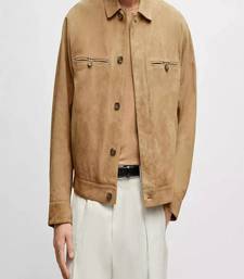 Qawach men's genuine suede leather brown collar jacket button style