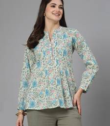Product Name Blue And Green Printed Top With Mandarin Collar, Button Placket & Pintucks