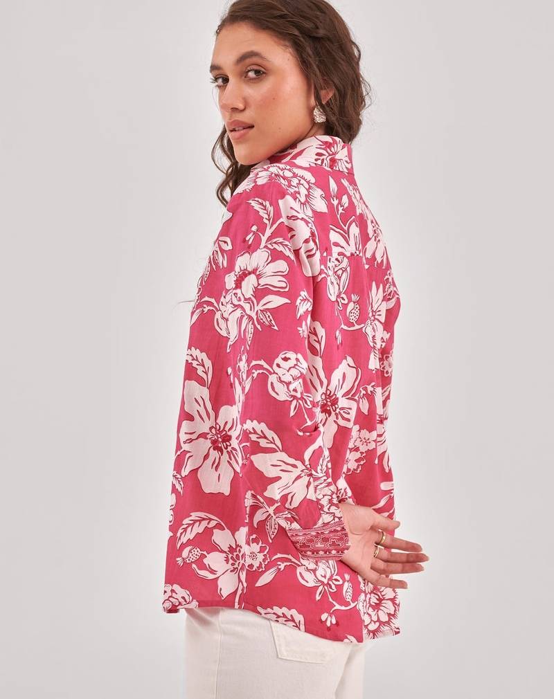Fuchsia floral printed casual shirt with spread collar, button placket & long sleeves