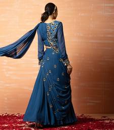 | Product Description | Featuring A Blue Predraped Sharara Saree In Georgette Base With Intricate Hand Embroidery. |