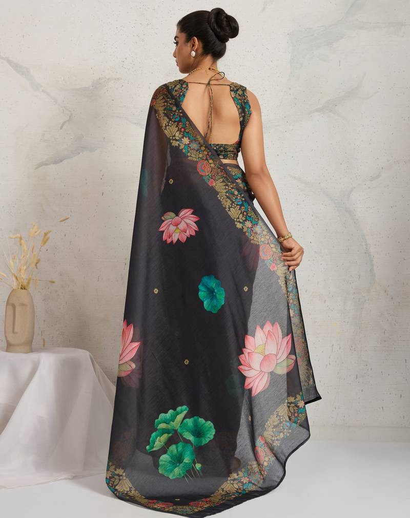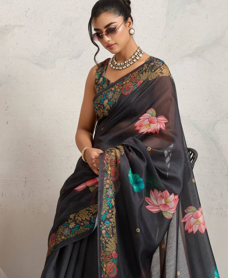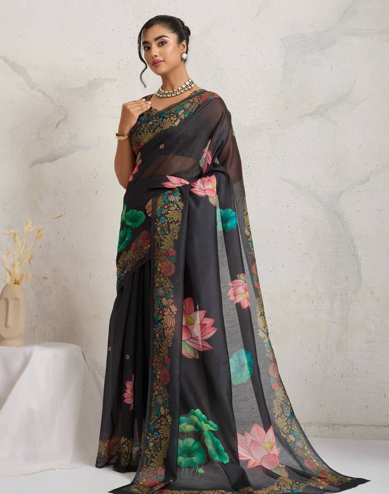 Black floral print silk ethnic causal wear saree with blouse