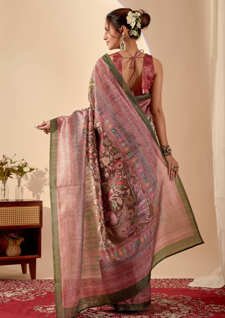 Green digital floral print chiffon festive ethnic saree with blouse
