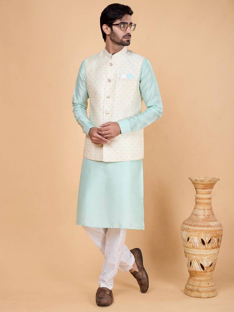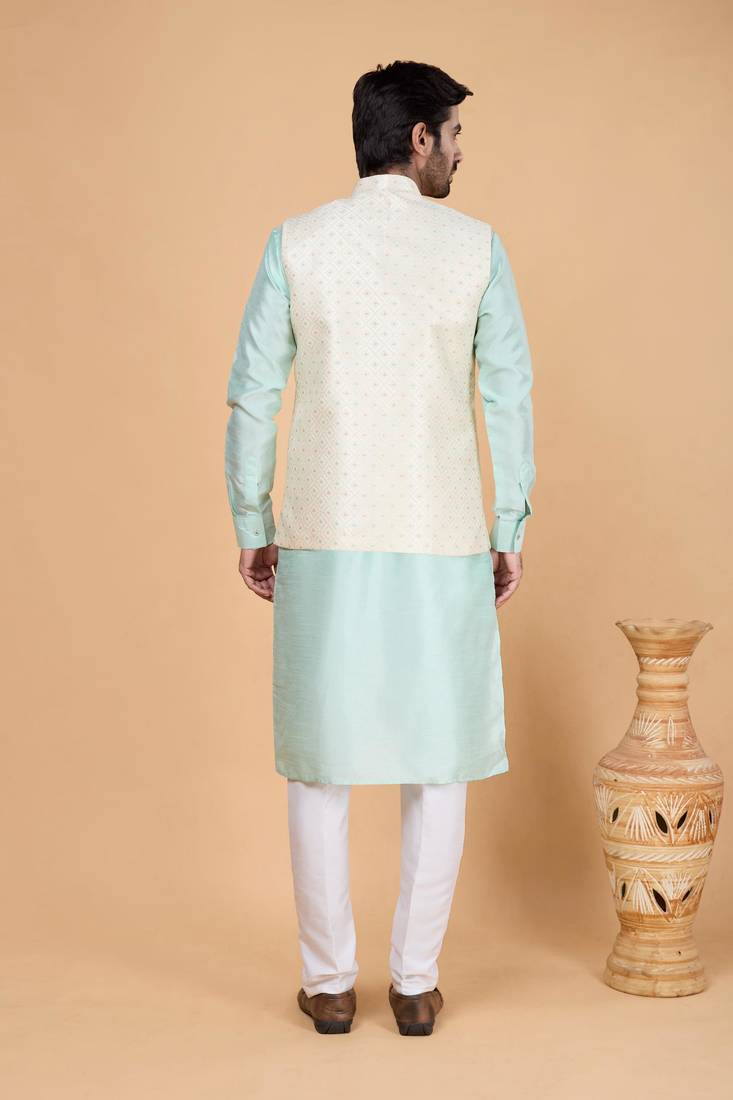 | Product Name | Cream Jacquard 3 Piece Kurta Jacket Set For Men | |