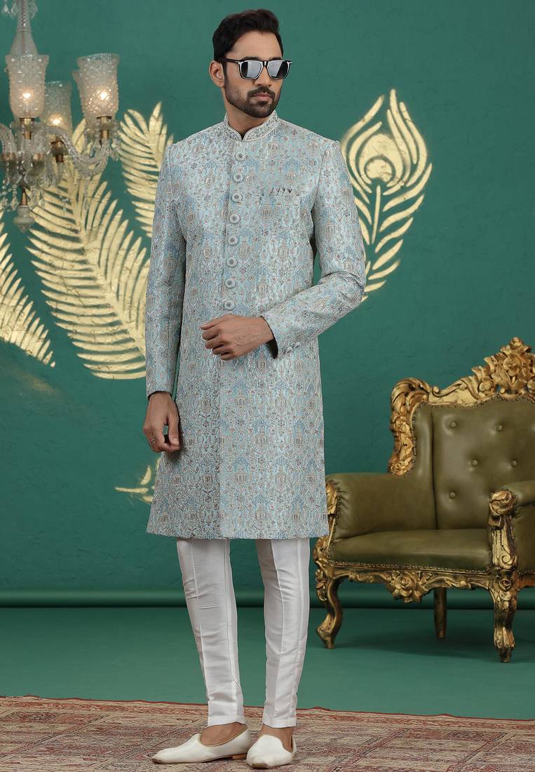 | Product Name | Firozi Green Computer Thread Work On Art Silk Sherwani For Men | |