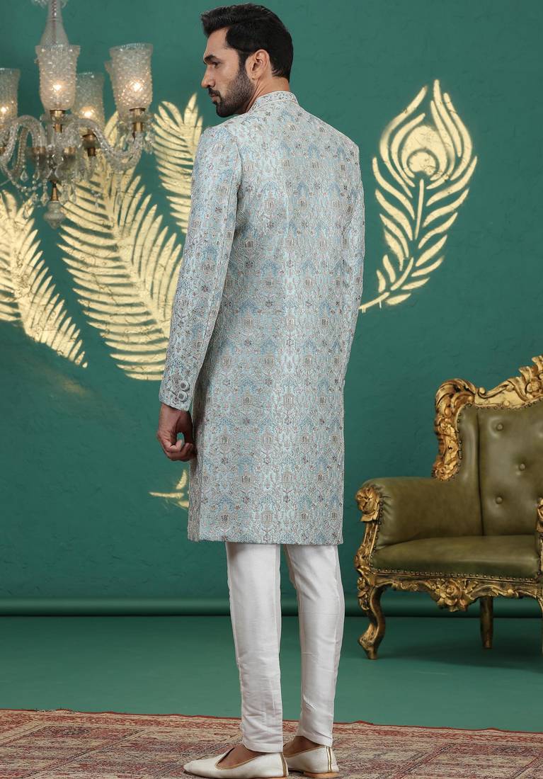 Firozi green computer thread work on art silk sherwani for men