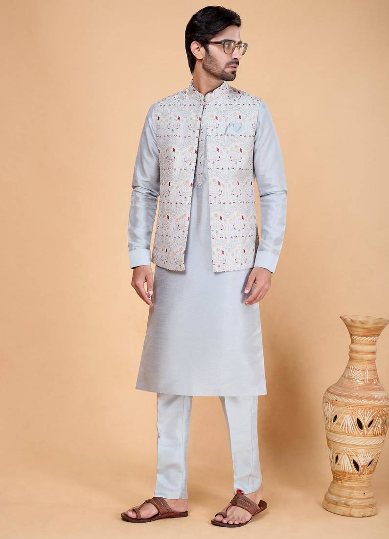 | Product Name | Grey Art Silk 3 Piece Kurta Jacket Set For Men | |