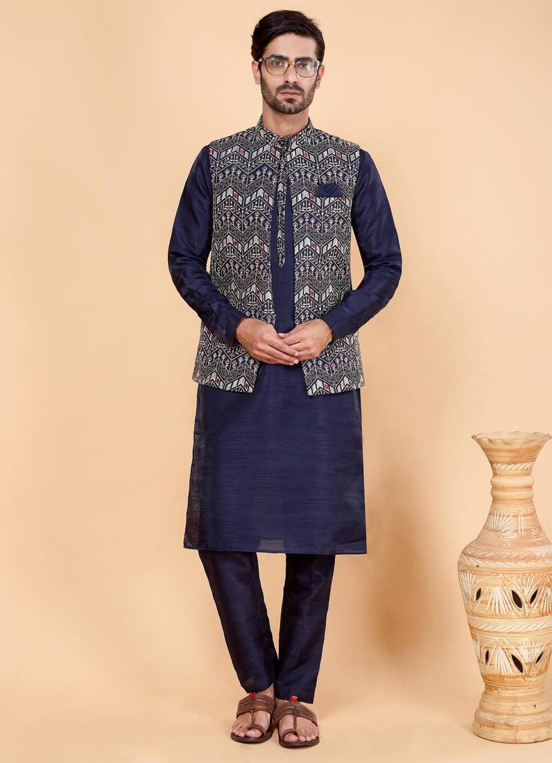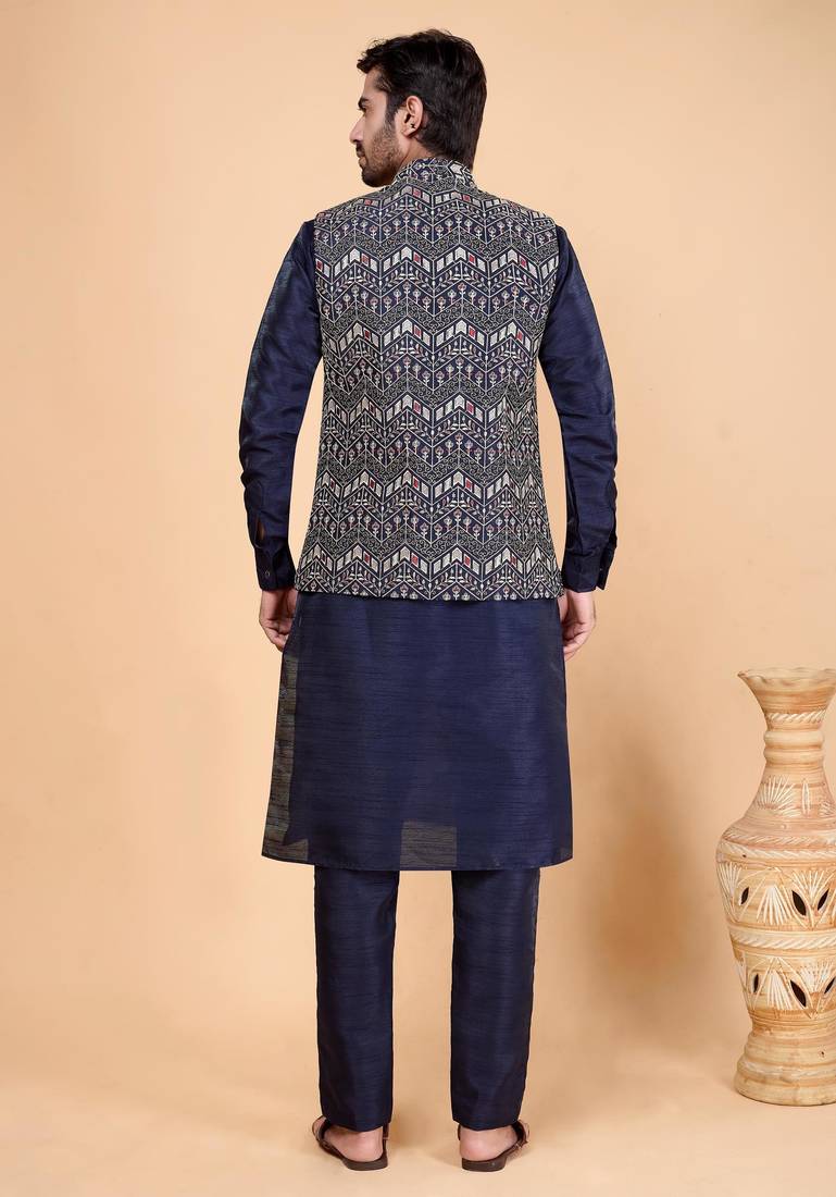 | Product Name | Navy Blue Art Silk 3 Piece Kurta Jacket Set For Men | |
