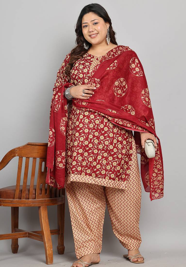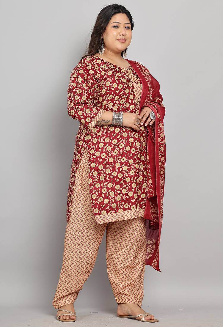 Maroon & beige cotton blend printed ready to wear patiala salwar suit stitched
