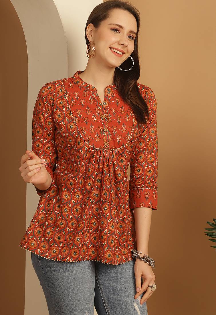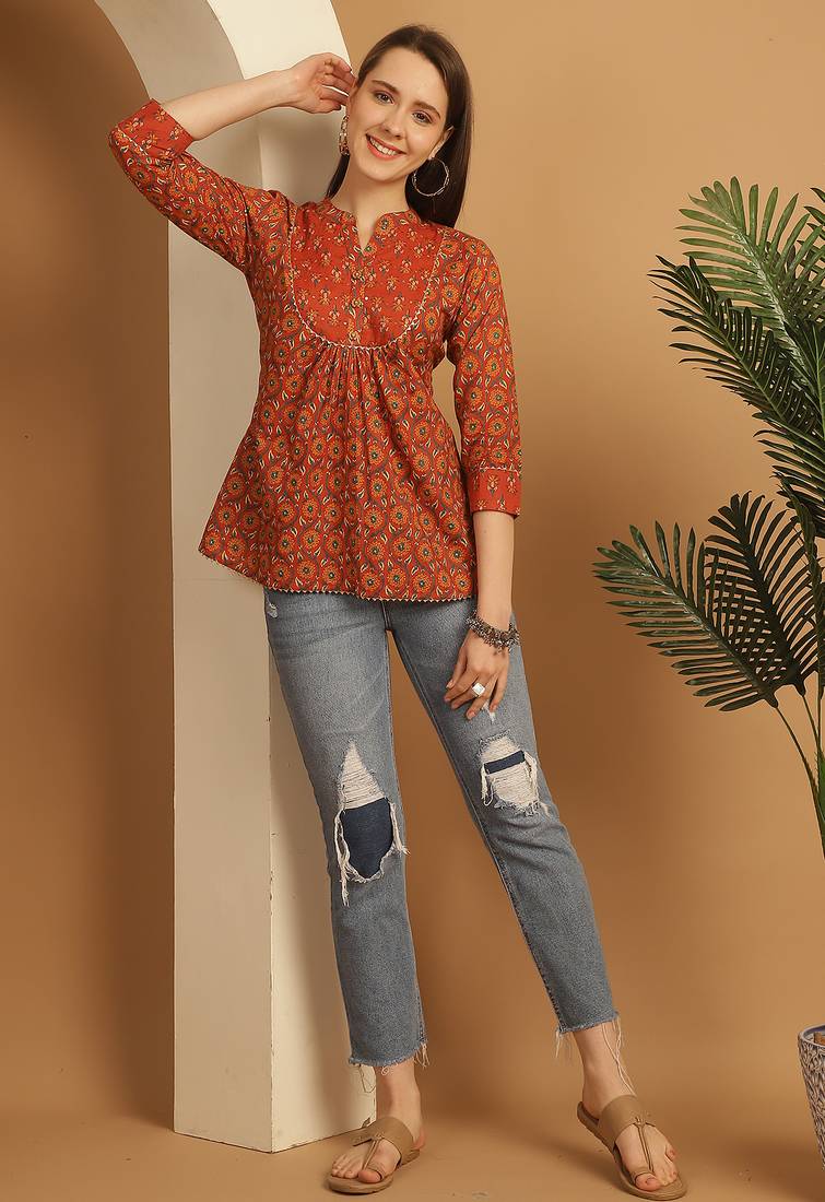 | Product Name | Orange Women's Pure Cotton Jaipuri Printed Short Top | |