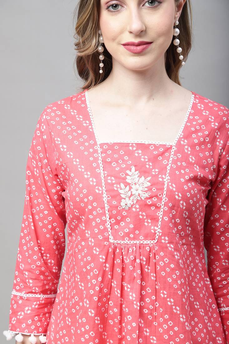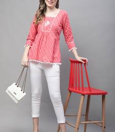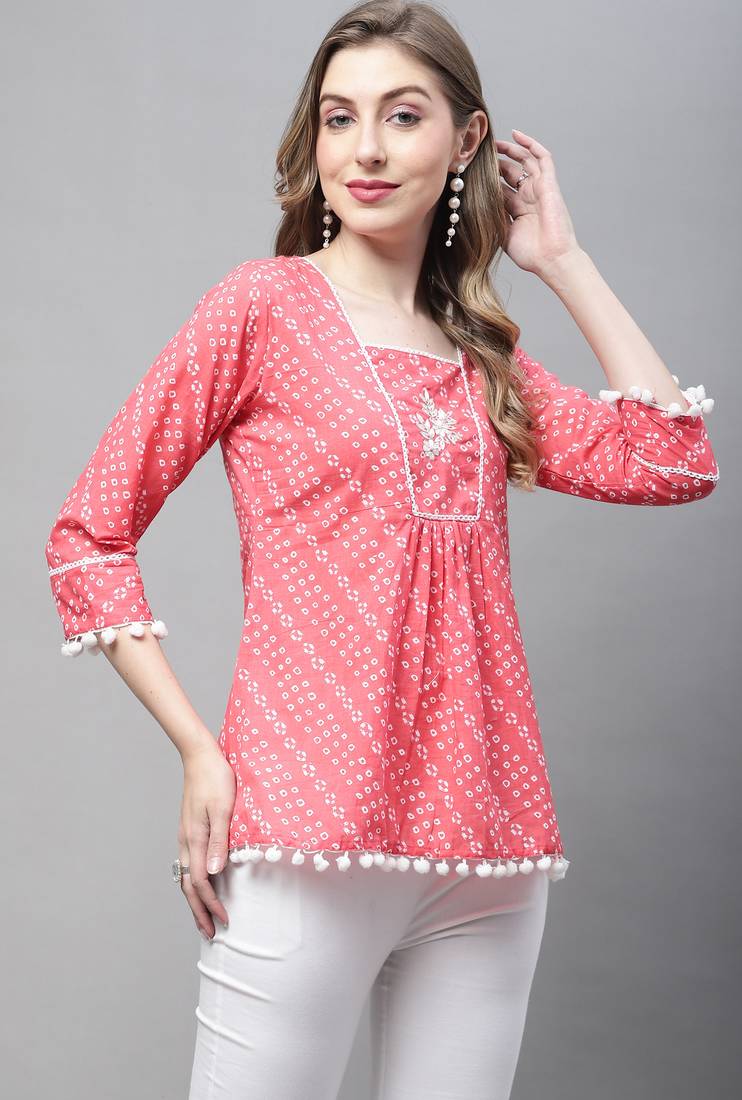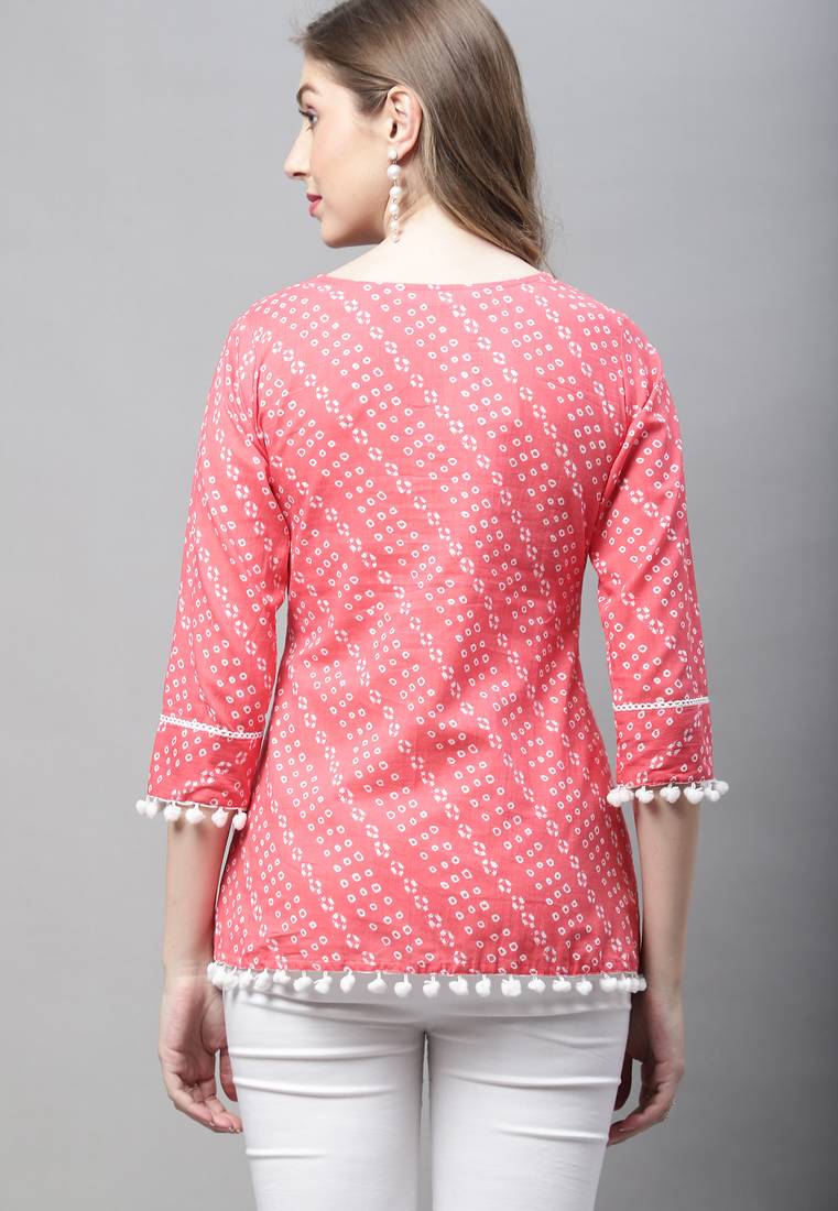 | Product Name | Peach Women's Pure Cotton Bandhej Print Short Top | |